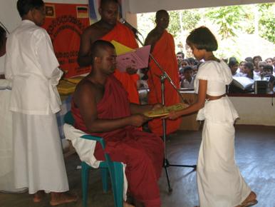 Funds donated to the Washington Buddhist Vihara after the tsunami of one year ago by friends of the Vihara have been sent to the Janavijaya Foundation at the Bikkhu Training Center at Maharagama, Sri Lanka. These funds have been utilized for various projects launched by the Janavijaya Foundation for tsunami relief work. While other foundations have been engaged in building new homes for those displaced by the tsunami, the Janavijaya Foundation has dedicated most of funds collected to assist the child victims of the tsunami. The Foundation built kindergartens and new homes, repaired damaged shrine rooms, and sent teams of doctors to remote areas to conduct workshops on public health. In addition, the Foundation provided various self-employment opportunities, such as purchasing sewing machines and brick-making machines for displaced families to help them generate income and rebuild the community. Hundreds of bicycles were also distributed among the victims, along with other goods. In addition to this, in tsunami affected areas schoolchildren received school uniforms and other educational supplies to enable them to return to school. One of the most important initiatives of the Janavijaya Foundation is the endowment of scholarships for tsunami affected children, from kindergarten through university level. Still, much is to be done, so please keep helping! To view additional photos of the tsunami relief work, please visit the Vihara’s website at www.buddhistvihara.com.
